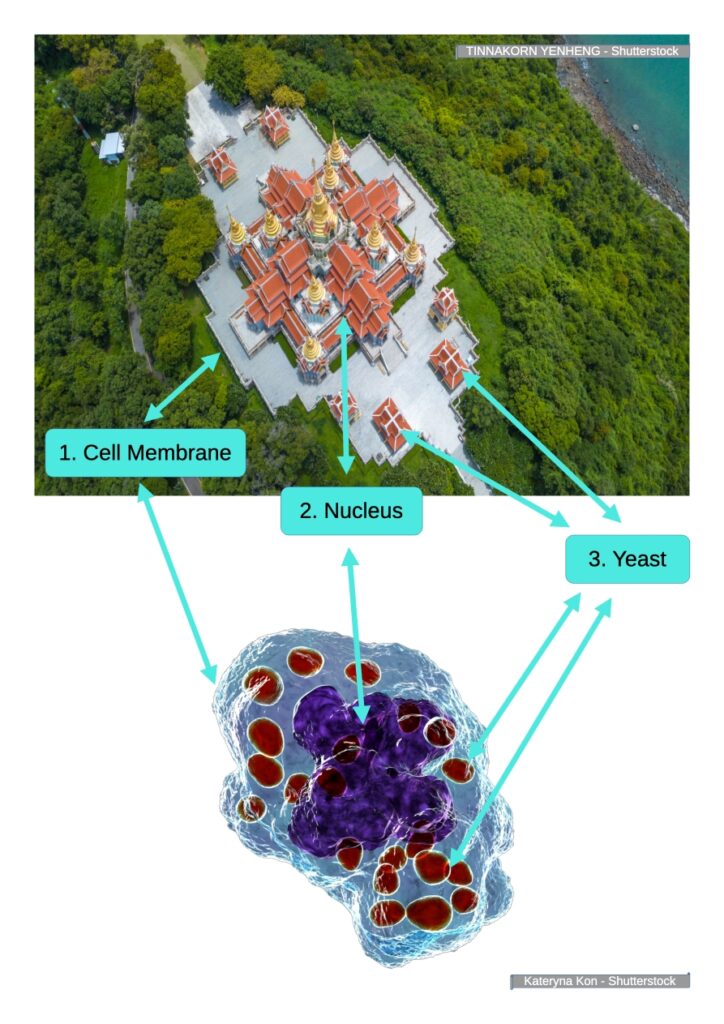 • 2. „The Main Chedi as the Nucleus, Endoplasmic Reticulum, and Golgi Apparatus”  The towering, gilded chedi resembles the cell nucleus—the control center—surrounded by smaller structures that can be compared to the endoplasmic reticulum (narrow temple corridors) and the Golgi apparatus (ornate spires modifying „proteins”—in this case, prayers and offerings).
