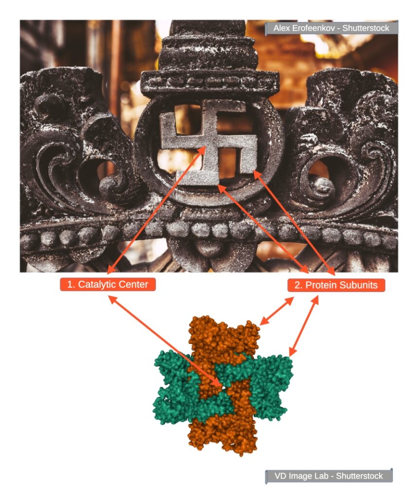 • 2. The arms of the swastika in Balinese ornaments and Buddhist symbols turn out to be precise reflections of the arrangement of protein subunits in PAICS. Each of the four pairs of subunits forms an arm of this sacred structure, just as the four arms of the swastika symbolize the four elements or the Four Noble Truths.