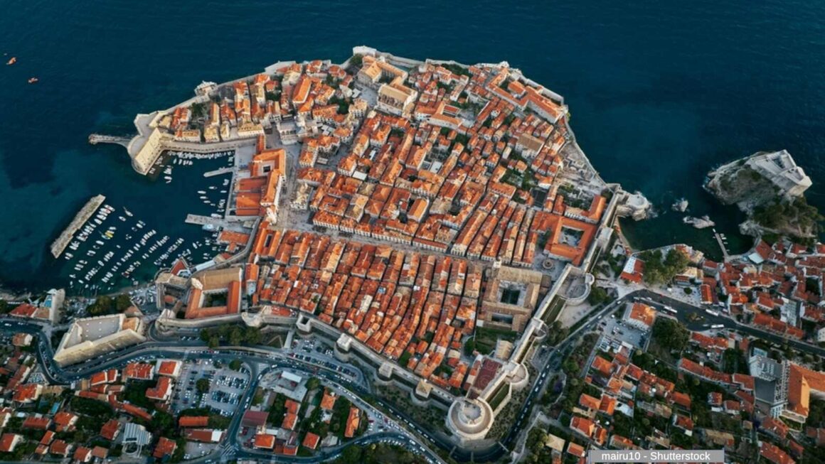 , Photo description: Dubrovnik, Croatia. Aerial view of the old town with rooftops and Adriatic sea. Top view from drone.