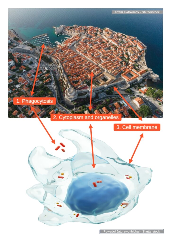 After 42 installments of our series exploring surprising parallels between the cellular world and architecture – from the Khai Dinh Tomb as a columnar cell to the Masjid Mosque as a human cell – Dubrovnik emerges as the most perfect reflection of a macrophage. This medieval port city, seen from above, reveals astonishing similarities to an immune cell undergoing phagocytosis. Is it mere coincidence that builders centuries ago replicated in stone processes that modern science has only recently named?