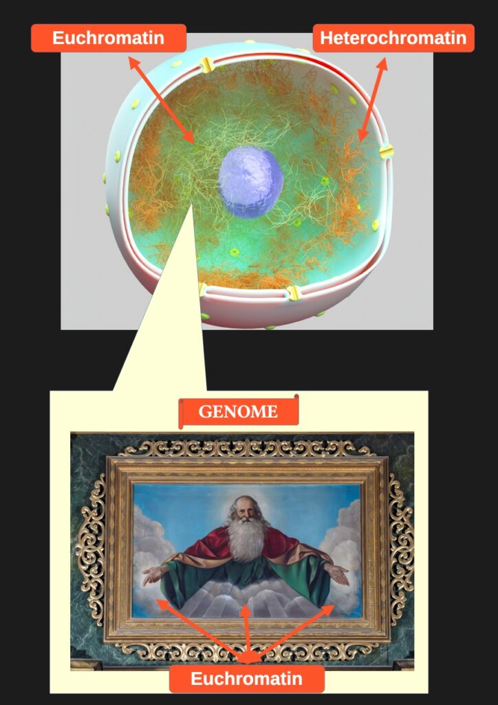 Now look at the image of God. The arrows point unmistakably: the clouds surrounding God are euchromatin. Bright, loose, open clouds — active chromatin, from which the Creator emerges.