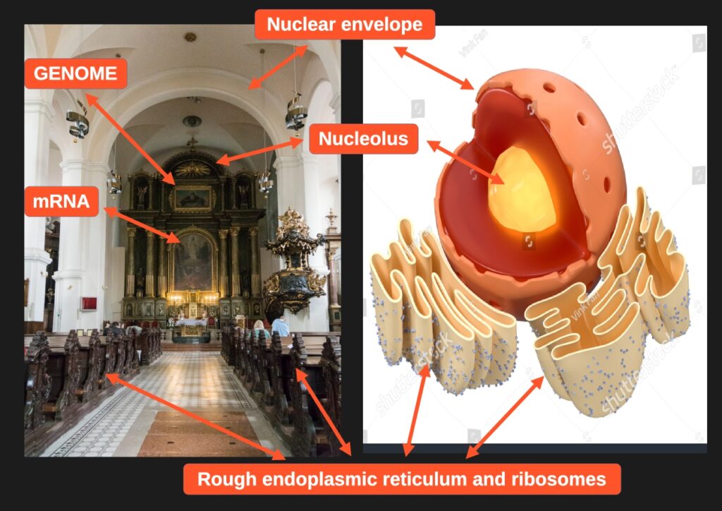 The nuclear envelope – the great arch separating the presbytery from the nave. This arch reveals the structure of the nucleus itself — the architectural boundary between sacred space (the nucleus interior) and the rest of the cell. In the biological diagram – a red, double-layered shell with pores. In the church – a massive arch with a passage, through which the Word passes from the sanctuary into the nave. And what passes through? The Logos. Jesus Christ as mature mRNA — who Himself said: „I came from the Father and entered the world” (John 16:28). The mRNA leaves the nucleus through the nuclear pores to carry the Father’s message to the ribosomes – to the faithful waiting in the nave.