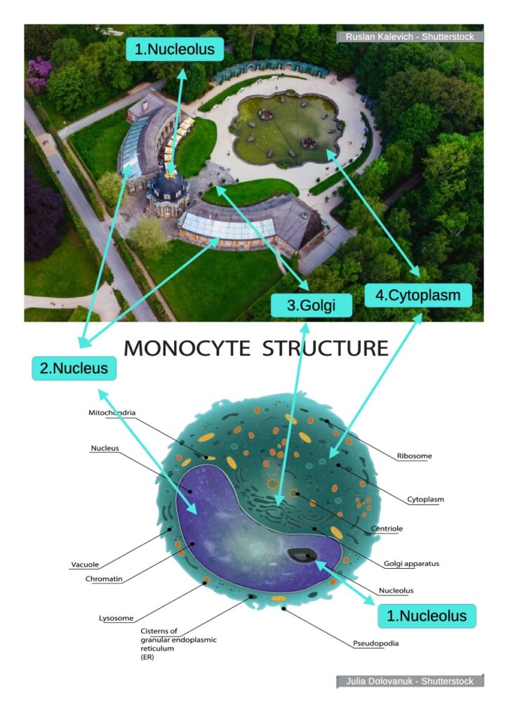 • 1. The palace’s side wings perfectly mirror the monocyte’s nucleus – their semicircular shape and symmetrical arrangement precisely match the characteristic „kidney-like” form of the cell nucleus. Just as the nucleus stores genetic code, the palace wings guarded the most important secrets of power.