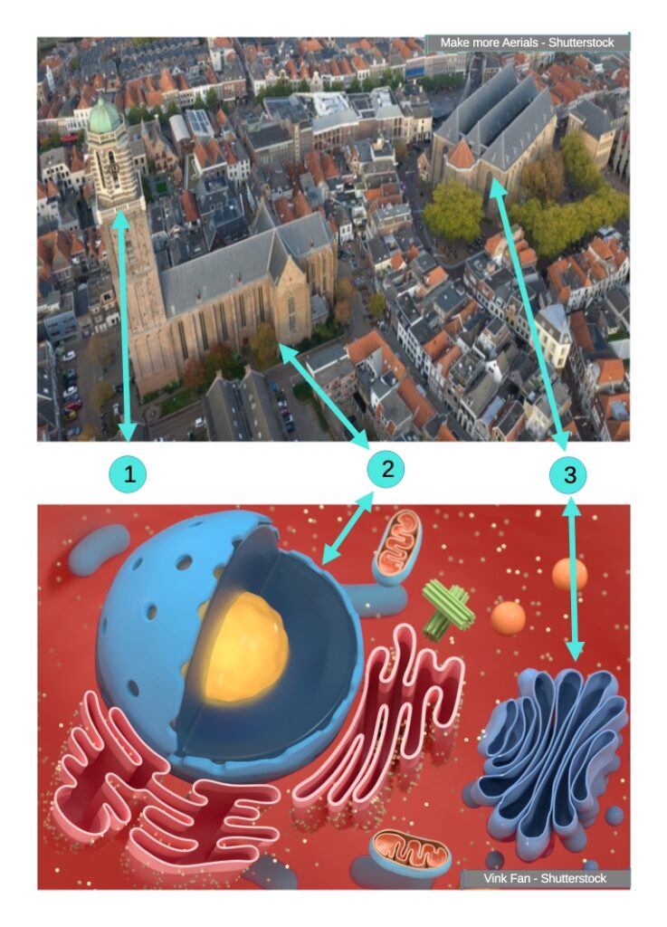 - 3. „St. Michael’s Church – The Golgi Apparatus” Opposite Basilica of the assumption of the Blessed Virgin Mary stands the „St. Michael’s Church”. This majestic building perfectly fits the role of the „Golgi apparatus” in our cellular analogy. The Golgi apparatus is the sorting, modifying, and distribution center for proteins and lipids. Similarly, St. Michael’s Church, as a spiritual and cultural institution, is where ideas and values are „processed” and disseminated, shaping the future of the city. Visually, the tower and parallel roofs of the Academy resemble the stacks of cisternae in the Golgi apparatus – layered structures that act as the cell’s logistics hub. The collaboration between Basilica of the assumption of the Blessed Virgin Mary (the nucleus and ER) and the St. Michael’s Church (the Golgi apparatus) mirrors the close cooperation of organelles in the cell: proteins produced in the endoplasmic reticulum are sent to the Golgi apparatus, where they are modified and prepared for transport to other parts of the cell or outside.