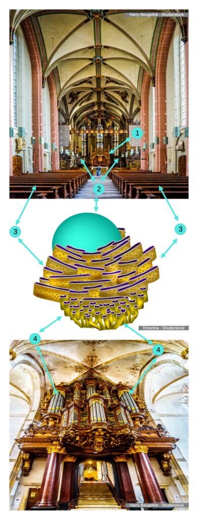 - 4. „Smooth Endoplasmic Reticulum – The Organs” The smooth endoplasmic reticulum is responsible for lipid synthesis and detoxification in the cell. In the church, this role is played by the „organ”, which enriches the liturgy with music. – „Function in the liturgy”: The organ, like the smooth endoplasmic reticulum, “purifies” and enhances the atmosphere of the liturgy. Its sounds lift the prayers of the faithful toward heaven, creating harmony and beauty that aid in contemplation and focus. The organ in the photo is in the church of St. Michael. I have no way of publishing the original organ from the Basilica, so I replaced it with something as similar as possible. You can see the original in this link. https://fr.dreamstime.com/église-d-organe-basilique-notre-madame-ciel-zwolle-les-pays-bas-image137682498