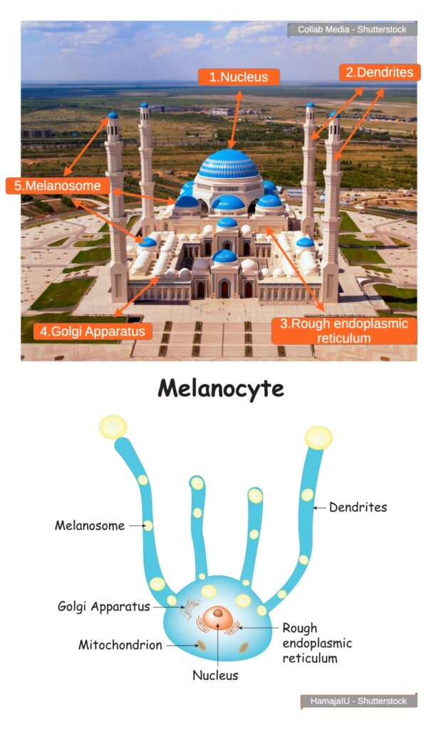 • 5. „Melanosomes as the Blue Smaller Domes” – Melanosomes are organelles within melanocytes where melanin is produced and stored. In the mosque, the smaller blue domes scattered around the main dome resemble melanosomes. They are smaller in size but equally significant, adding color and character to the structure, just as melanosomes give color to the skin.