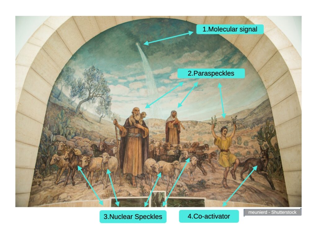 ,The Road to Bethlehem as Protein Transport to the Transcription Site Mural Scene: The shepherds, sheep, and dog travel along a road to reach Bethlehem. The road symbolizes the transport of proteins and RNA complexes through the nuclear territory to the transcription site. This journey is a coordinated effort involving paraspeckles (shepherds), nuclear speckles (sheep), and coactivators (the dog) to ensure that all necessary factors reach their destination for pre-mRNA transcription and processing.