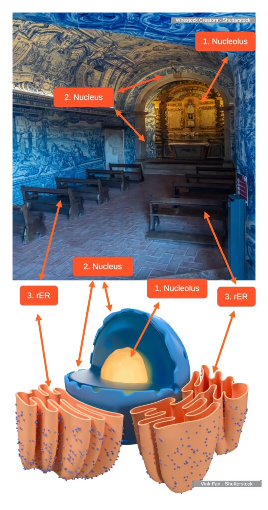 • 2. „The Presbytery – The Fortress’s Cell Nucleus” The presbytery space corresponds to the fibroblast’s cell nucleus. Here, liturgical „instructions” (missals) are stored, and the ceremony is directed, just as the nucleus manages the expression of protein-coding genes. The enclosed presbytery, accessible only to the priest, reflects the strict control of access to DNA in the cell nucleus.