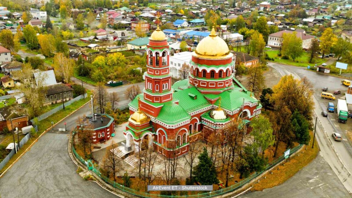 ,Photo description: Aerial view of temple in the name of the Holy Apostle and Evangelist John the Theologian. City of Verkhnyaya Salda. Russia.