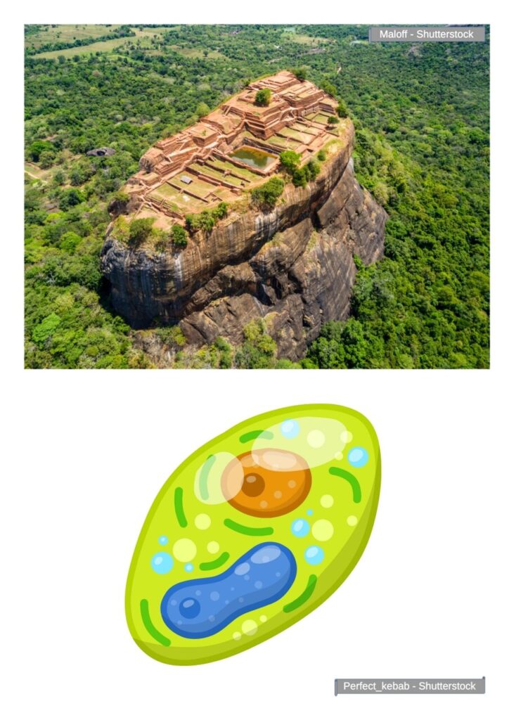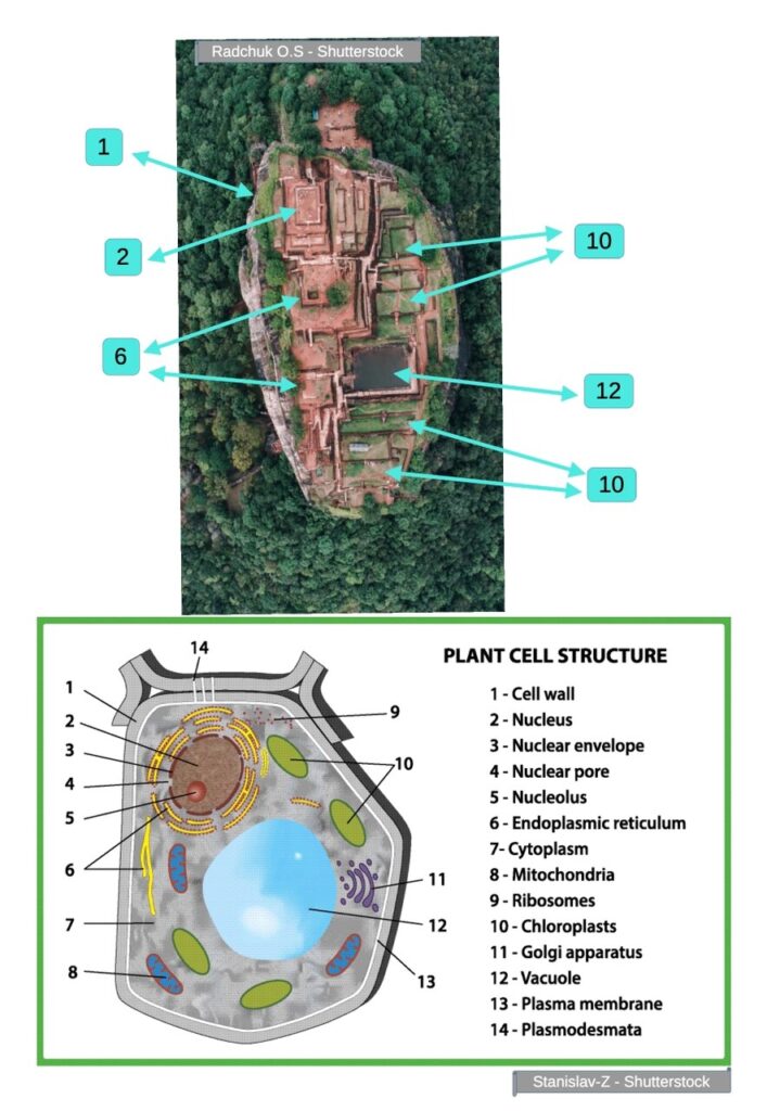 - 1. Cell wall – The rocky wall of Sigiriya – a powerful, vertical rock wall that protects the interior of the fortress, resembles a cell wall of plants. This wall gives structure and protects against external threats. In a plant cell, the cell wall is a rigid structure made of cellulose that gives the cell its shape and protects it from damage.
