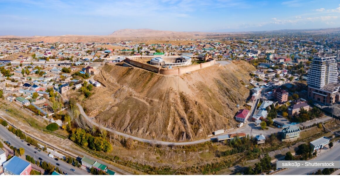 ,Photo description: Fortress Cup Kalai Teppe with bird’s eye view of Istaravshan. Istaravshan is a city in Sughd province, Tajikistan.