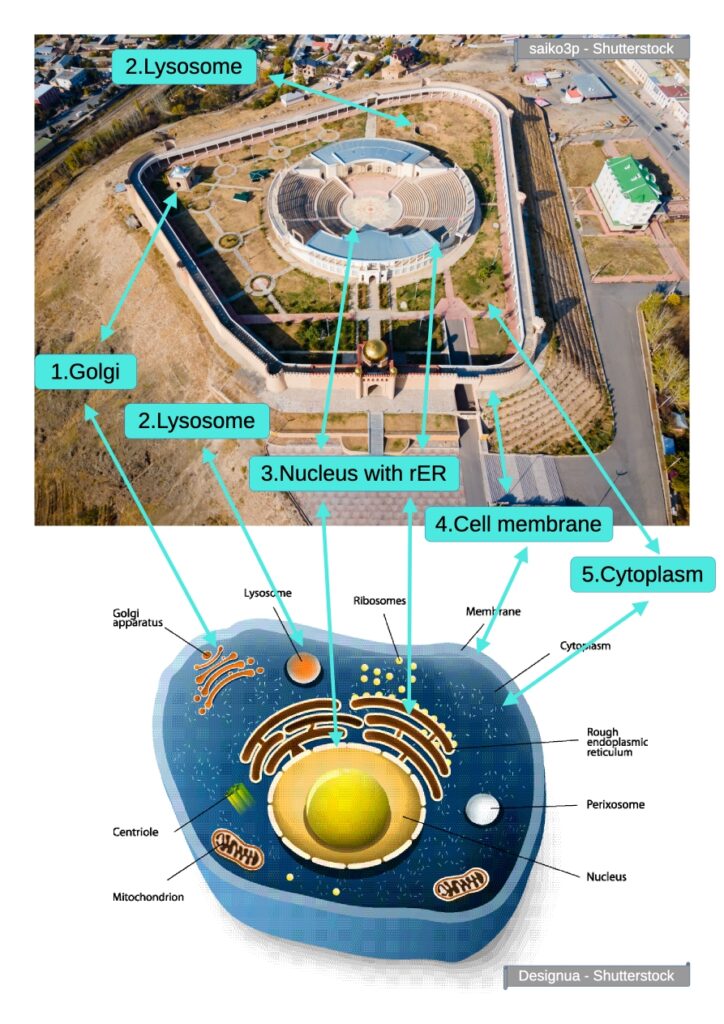 – Why does the center of amphitheater precisely mirror the cell nucleus, while the round auditorium mimic the endoplasmic reticulum?
