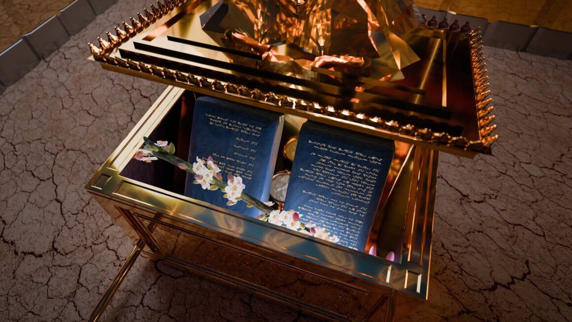 Illustration description: The Ark of the Covenant was opened, showing the Ten Commandments written in ancient Hebrew, with Aaron’s staff. 3D rendering of religious illustration. Shutterstock – joshimerbin.